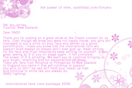 Hm I don’t know if I ever announced on here how Soshified held a project where soshified members were allowed to submit in personal messages (and money if you wanted too also) and these messages were placed in a book and sent off to Chunji Radio. This project was planned almost immediatly after Dream Concert to support our girls =) Well the projects complete and here all the gifts and message template design. Click more to check it out, it turned out to look amazing 🙂 Sungmin also got gifts cause of the support he showed for SNSD after the DC incident (: