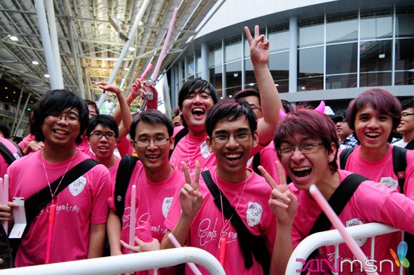 I was one of the guys in the pink shirts! There were around 70 of us in Pit B alone, and boy did we have a BLAST fanchanting and cheering for the girls. I yelled myself so hoarse I can’t even talk properly even now. Best night ever for me this year. I hope the girls come back soon so we can do it all over again ^_^