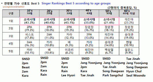 Korea Gallup confirms SNSD (Girls’ Generation) as “Singer of The Year” and two of their songs, Hoot and Oh!, also ranked as 1st and 2nd “The Most Popular Song in 2010” respectively. This is a huge feat because, as you may already know, Gallup is a professional research company which polls often referenced in the mass media as a reliable and objective measure of public opinion. That’s right, public opinion. The survey involved 3,401 random male and female citizens, aged 13 and above. SNSD ranked as #1 in almost all age group category except for the 60+ citizens.