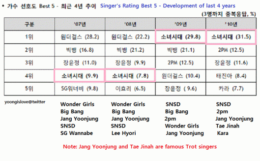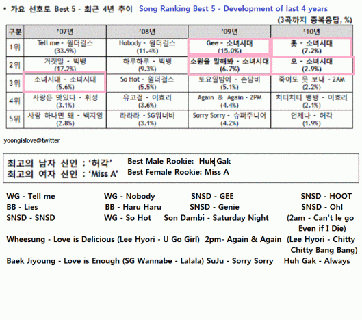 The picture above is the popular song ranking for the past four years. In 2007, SNSD’s Girls’ Generation ranked 3rd with 5,6%. Even though they didn’t make it to the top 5 on 2008, but the girls managed to have two songs ranked in 1st and 2nd for two consecutive following year — Gee and Tell Me Your Wish (Genie) in 2009, Hoot and Oh! in 2010.