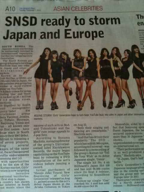 As part of their quest for global domination, the beautiful ladies of SNSD have once again made appearances in international newspapers. First up, they were mentioned in Malaysian newspaper Sin Chew Daily, in regards to their recent successes at the Golden Disk and Melon Music Awards. They also placed 1st in a list of top 10 artists from Korea for 2010 (box in the bottom right corner of the picture).
