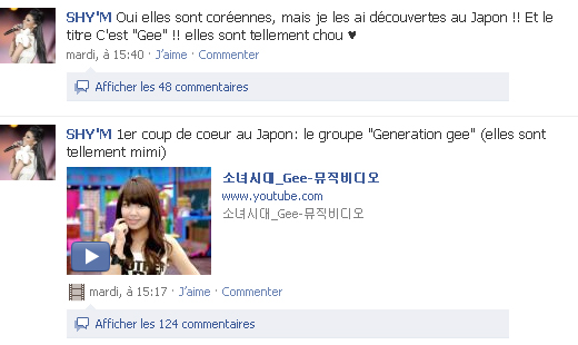 Finally, popular French pop singer Shy’m confessed that she is loving “Gee”, after discovering SNSD in Japan. She posted on her Facebook: