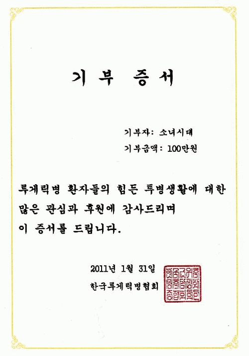 “In the name of SNSD, we have donated 1 million Won to the Korean ALS (Lou Gehrig’s Disease) Association“.
