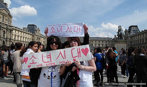 French K-pop fans gathered en masse at the Louvre, on May 1st in an attempt to convince S.M. Entertainment to add a second date to their SM Town Live’11 in Paris concert. In front of the iconic Lourve Pyramid, the flash mob sung and danced their hearts out in order to make their voices heard, and with numerous Korean media outlets present, the news was quickly relayed back to S.M. Entertainment who responded via a representative: