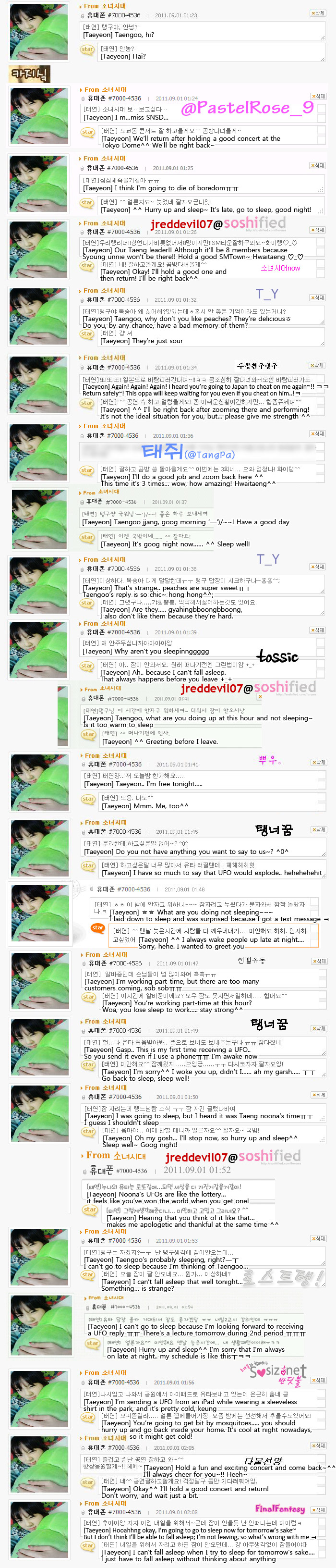 Courtesy of kiseki from the Soshified Forums, the following are the translated UFO replies from Taeyeon to her fans. I think her responses are really cute and so typical of her fun-loving nature. Enjoy !!!