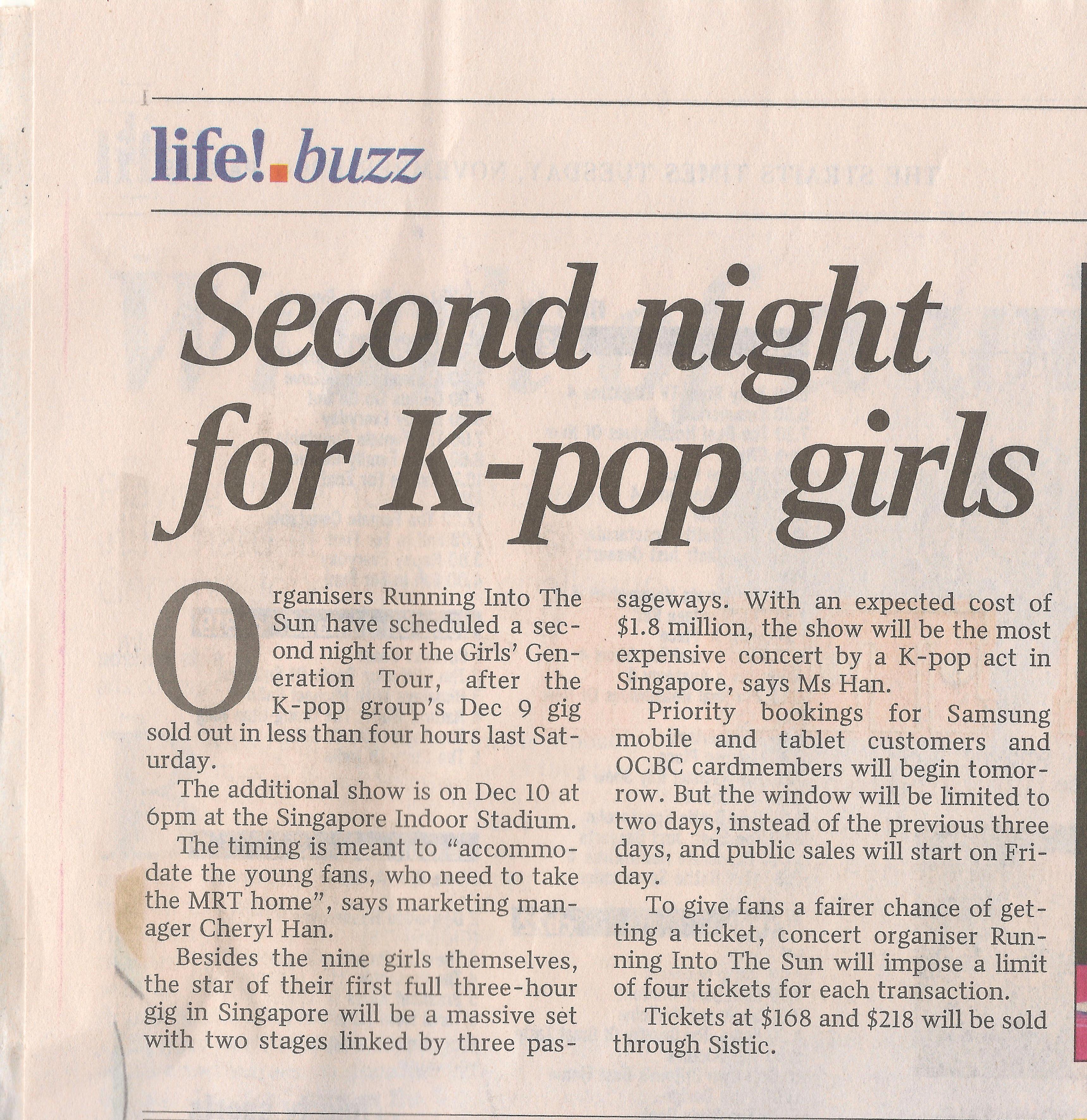 and Singapore knows it ! It seems the phenomenally fast rate at which the tickets sold out for the Girls’ 1st solo concert in our sunny Republic has warranted an article in our main daily English newspaper, The Straits Times ;).