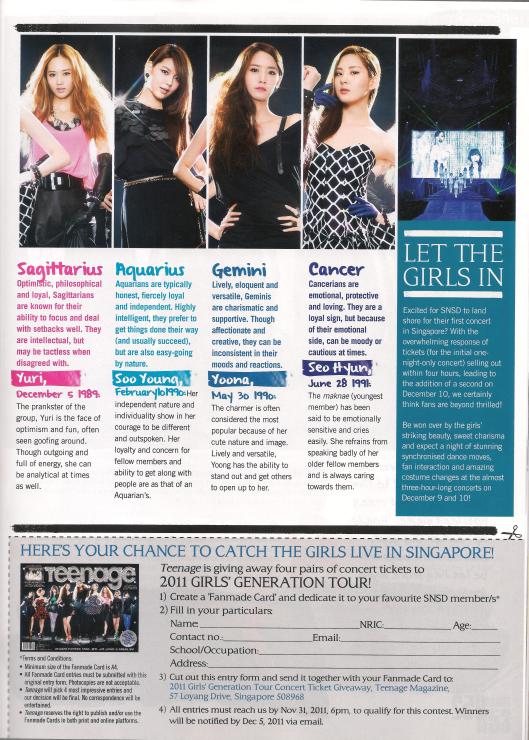 Within the magazine covers, 2 full articles are dedicated to the Girls; the first giving a quick thumbnail sketch of their musical hits in their career so far, since their debut in 2007, and the second, a rather insightful analysis of the 9 ladies personalities according to their horoscope signs (surprisingly, 9 of the 12 horoscope signs are represented here ;)).
