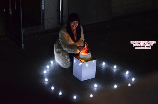 To mark the end of her stage debut, these hardworking and enterprising fans prepared a cake outside the musical’s performance venue and surrounded it with candles arranged in a heart shape (how sweet ;)).