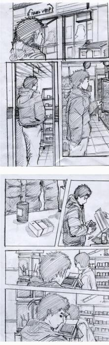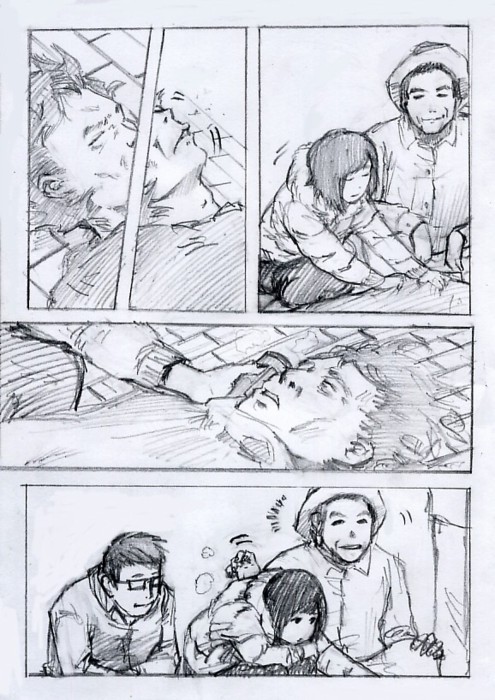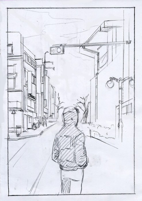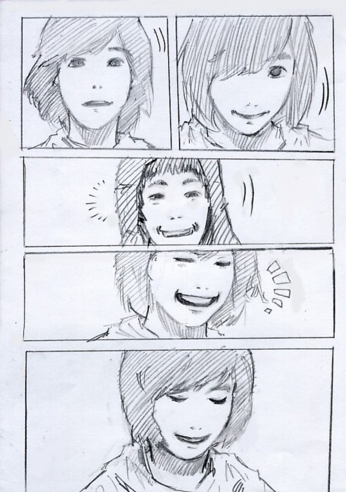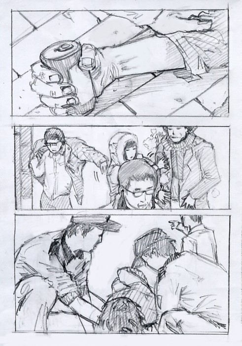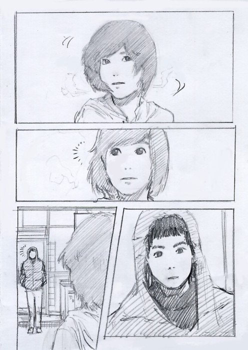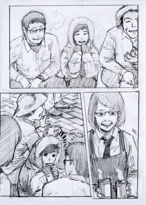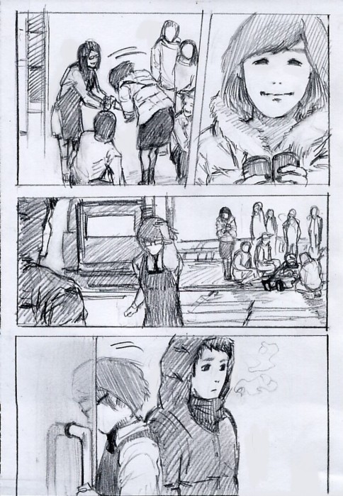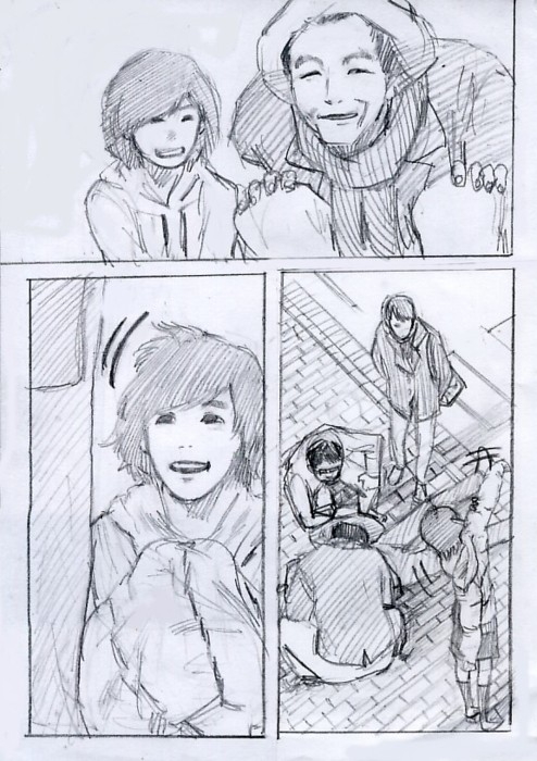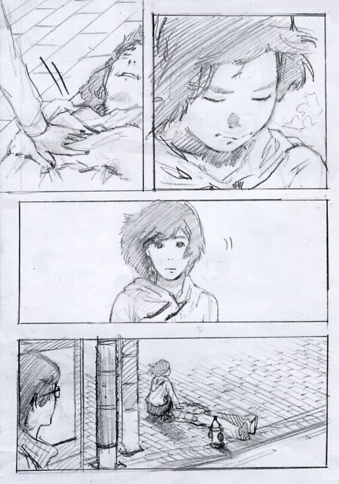 Suddenly, the door to the convenience store abruptly swung open and out stepped an extremely cheerful young lady with a perfect set of “eye smiles” (guess who ?). As the artist looked on, this person approached the old man and proceeded to warm his frozen hands with the warm coffee drink cans that she had just purchased for herself only moments ago. Not satisfied with only doing that, she next removed her coat and draped it around the old man’s body to keep him warm, without any regard to her personal comfort. When she noticed the artist staring at her from the entrance of the convenience store, her reply was an extremely shy “eye smile”.