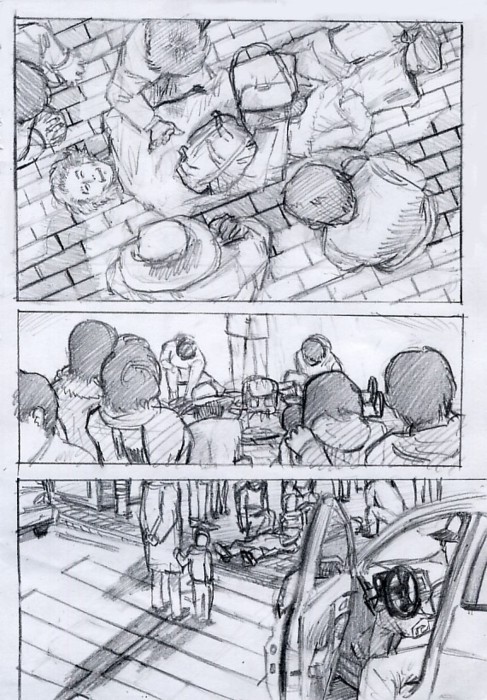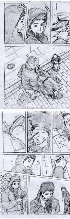 The account goes that the artist, whilst on his way somewhere, came across the old man sprawled on the street. Wanting to do the right thing, he then called the emergency services for an ambulance to bring the man to hospital for some medical attention, and hung around until it arrived.