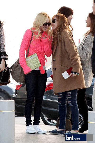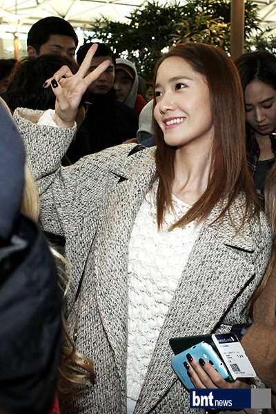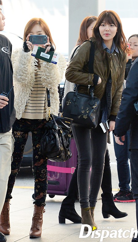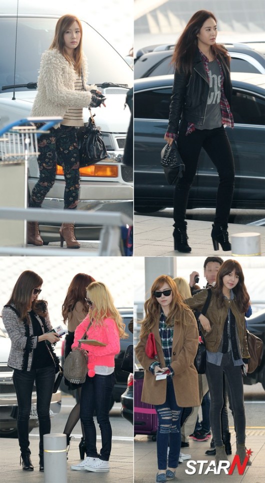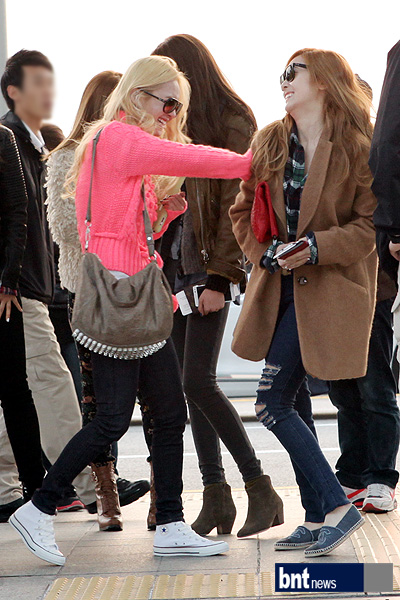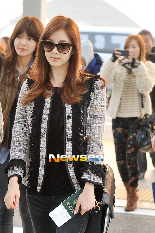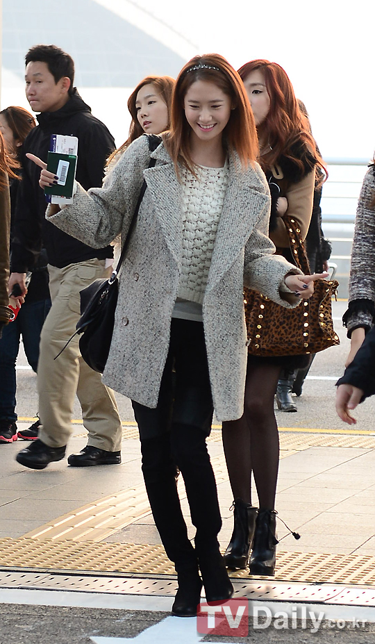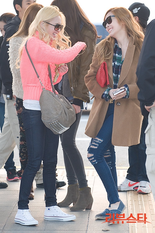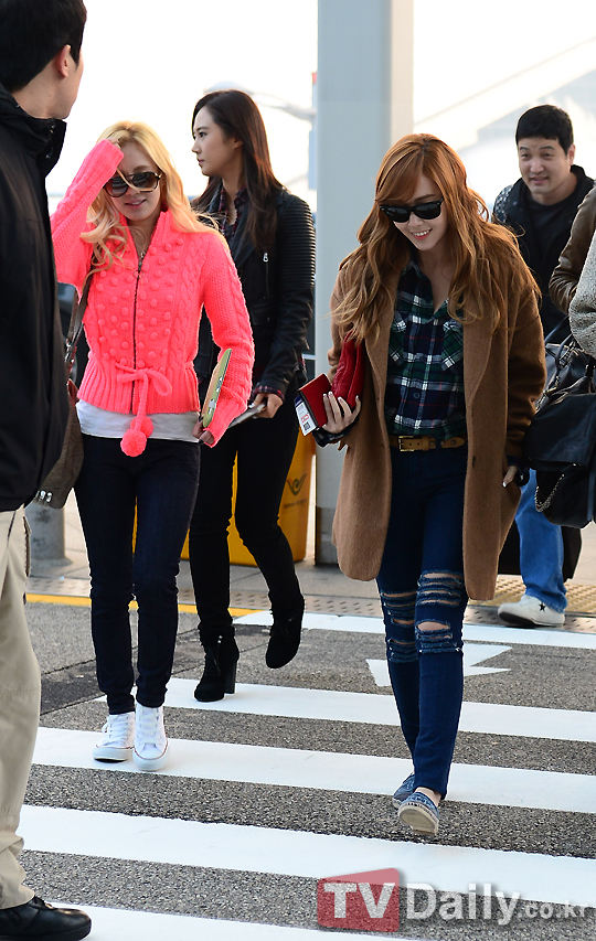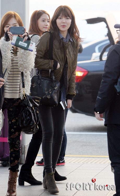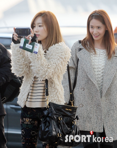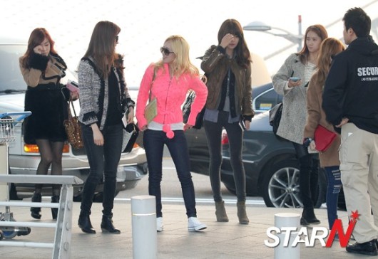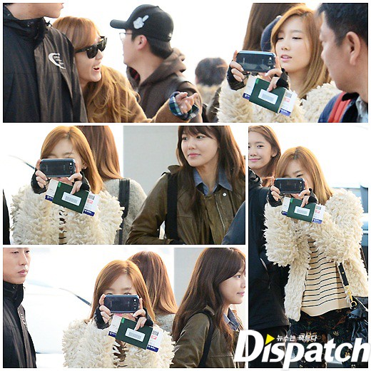 Haha only cause I can :P. SNSD headed off to Singapore yesterday for another stop on SMTown World Tour III in Singapore. The concert is scheduled for November 23rd at the Marina Bay Floating Platform. A few things I noticed about these airport pictures, Fany looked tired 😦 (besides the above pic). Dorky Taeng was totally being a paparazzi with her cell phone cam (or two cams? Looked like she has an iPhone 5 and a Droid?). And Hyo and Jessica were totally joking about something. Too bad we’ll never know about what :P. But all in all, the girls looked to be in a good mood heading to Singapore for the concert. SNSD hwaiting for another successfu
