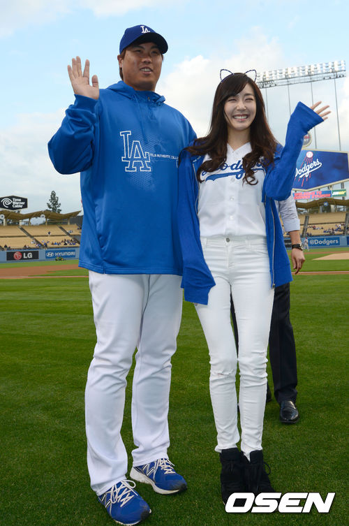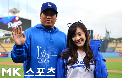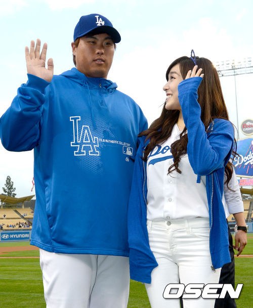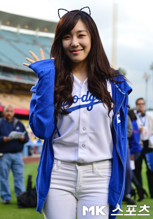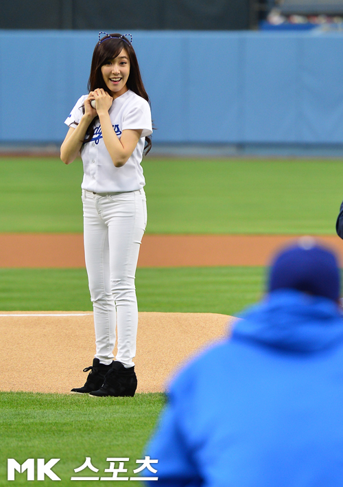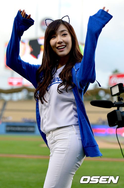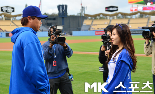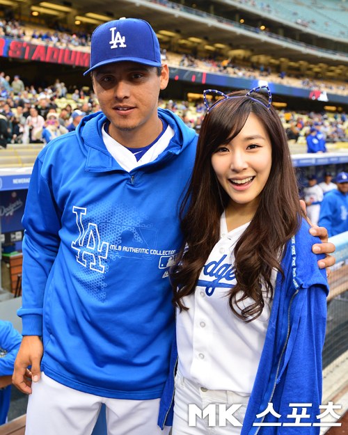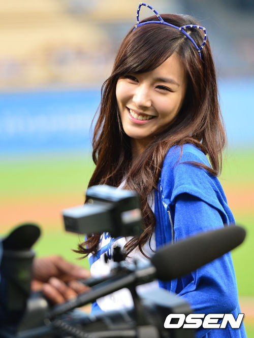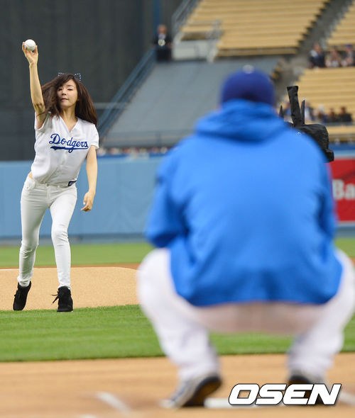 Not a perfect pitch, lol, but she’s still so adorable and beautiful in blue. It’s nice to know that she grew up watching Dodgers games too, especially when Park Chan Ho used to be part of the team 🙂 Darn you Dodgers for losing again though! -__-