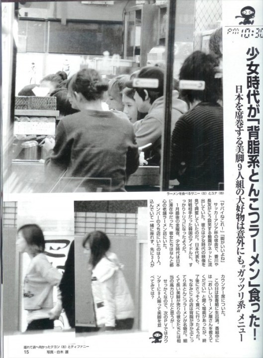 Right after their Music Station appearance, five of the girls dashed off to a nearby ramen shop, after it was recommended to them on the show. Whilst feasting away, they were snapped by the local paparazzi and later featured in the above news article.